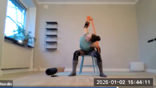 Nordin led a guided workout session that included a 45-minute routine consisting of laughing intervals, foam rolling, a full-body warm-up, and a humming meditation. She emphasized the importance of warming up properly and explained that the laughing intervals were designed to boost mood and reduce stress. Despite some technical difficulties with the meeting platform, Nordin attempted to adjust her settings to improve the participant experience.